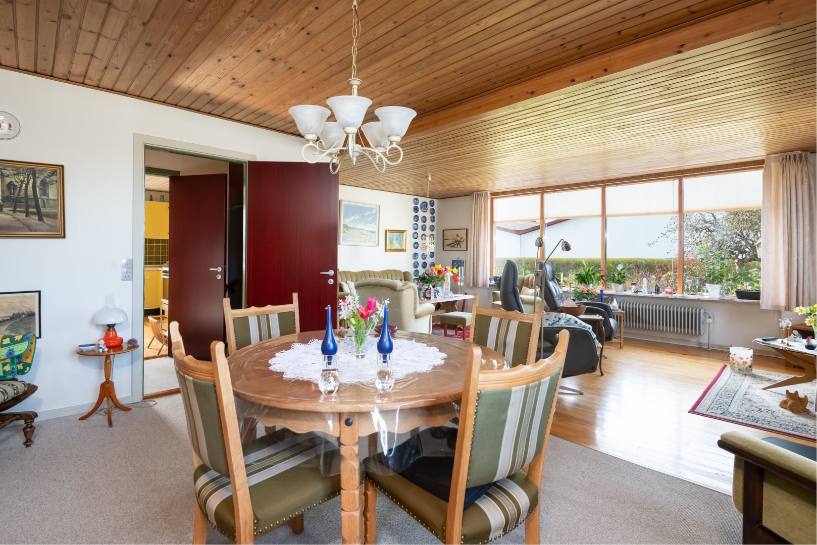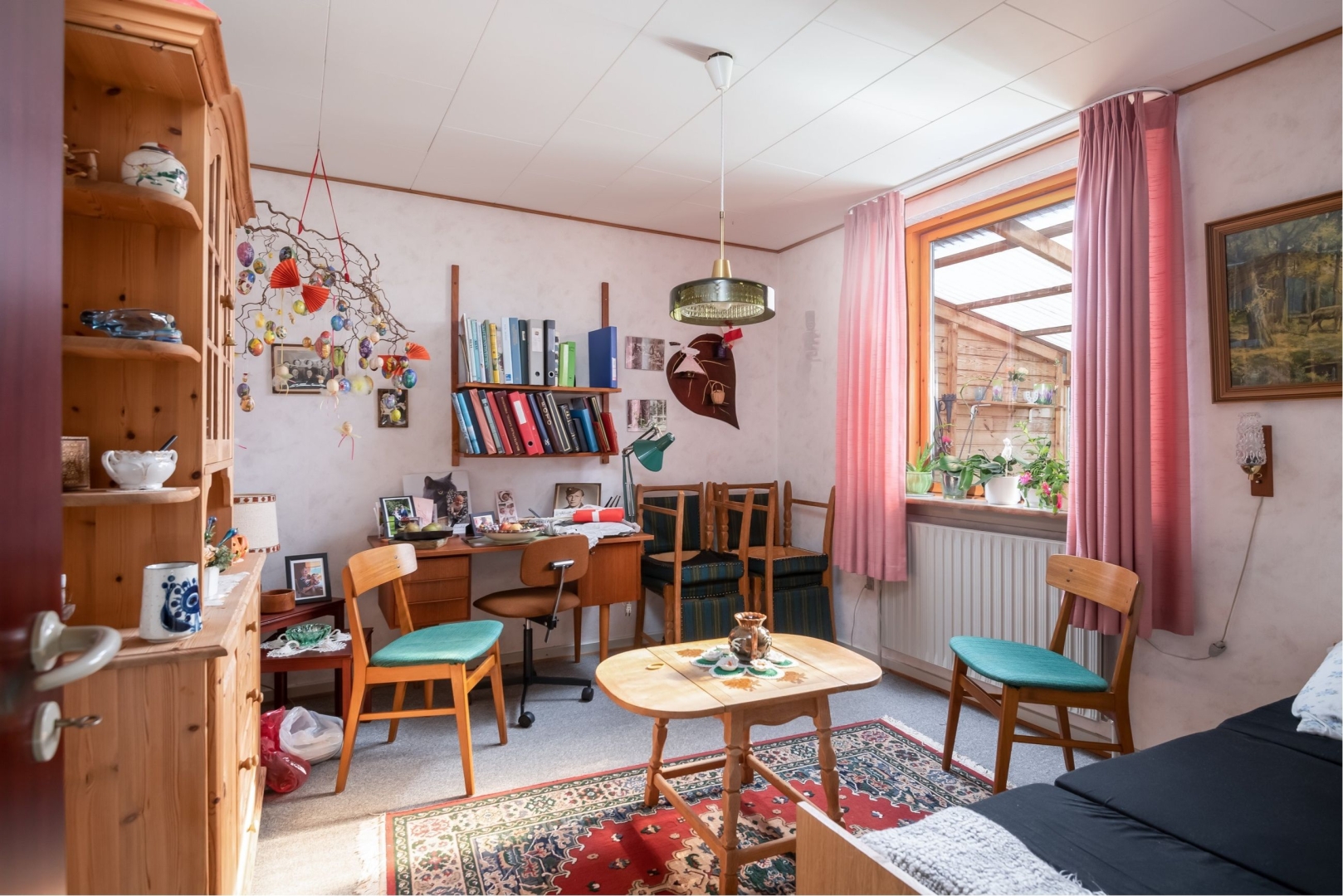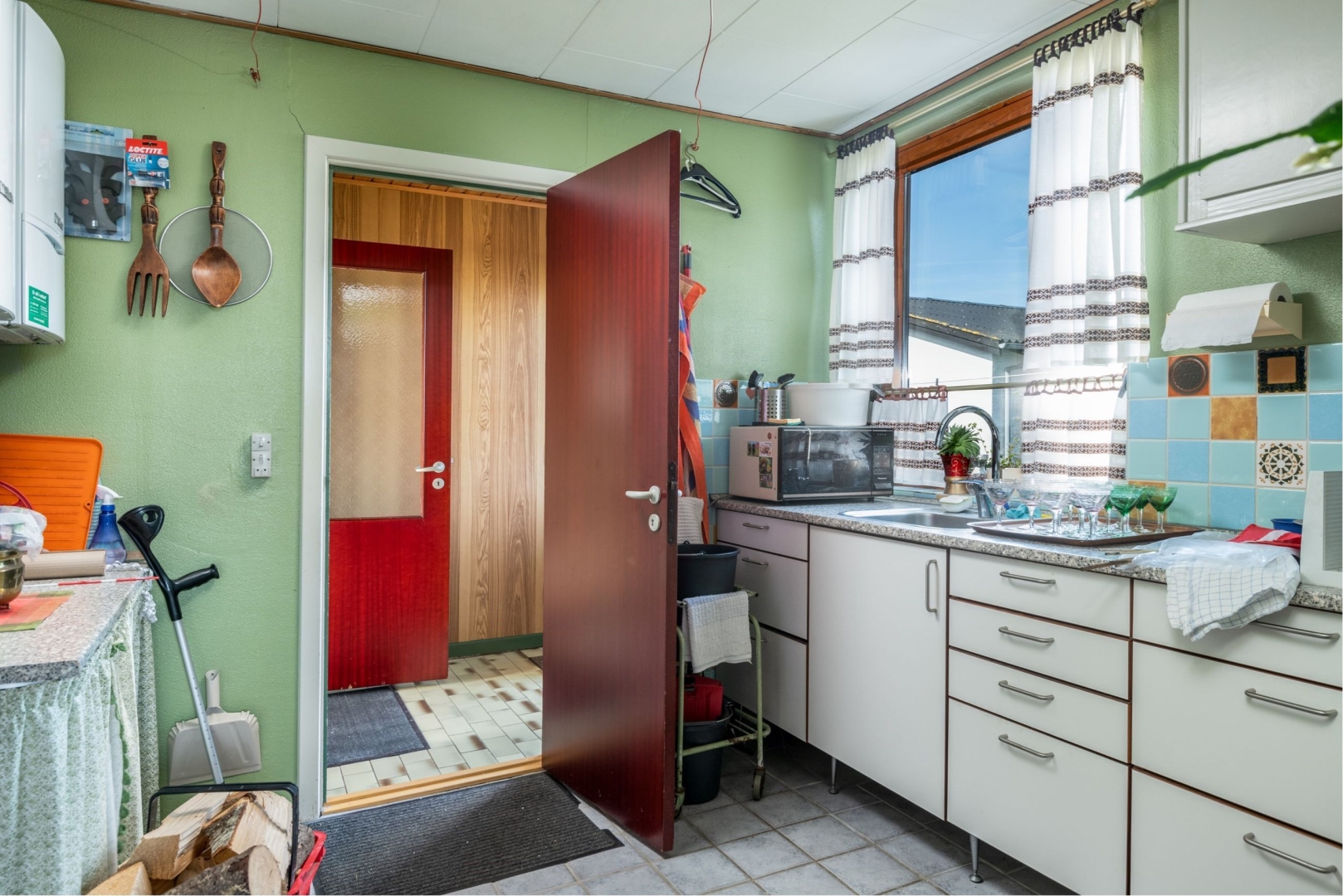Boligen er indrettet med vindfang med indgang til stort bryggers med bordarrangement, entré, pænt køkken med spiseplads, stor lys vinkelstue med nyere brændeovn, soveværelse, 2 værelser, badeværelse med bruseniche. Fra entré udgang til terrasse, derfra indgang til skøn havestue.