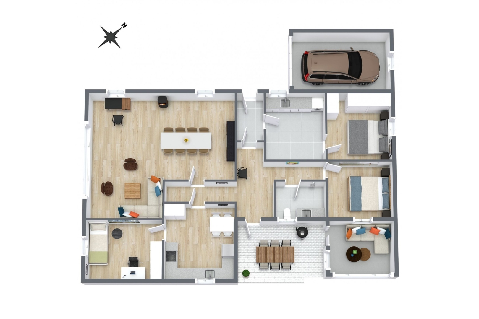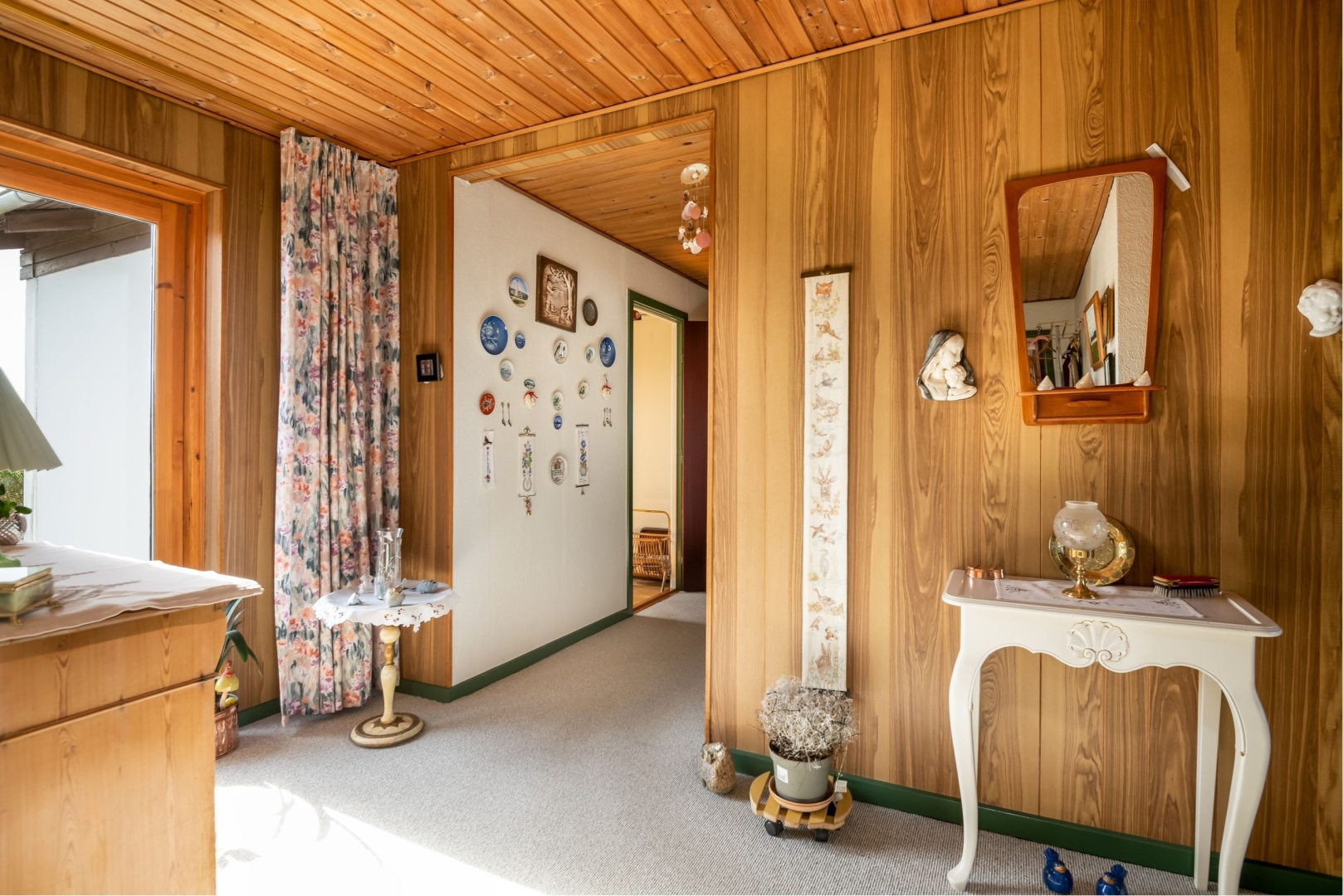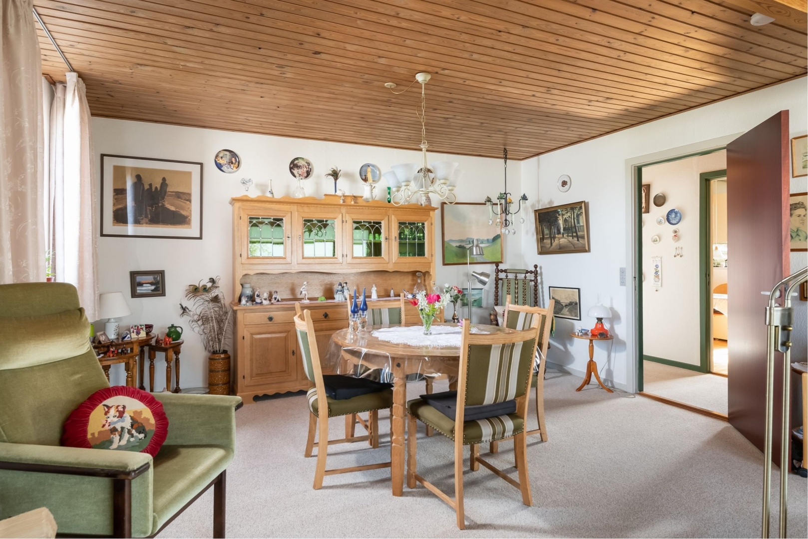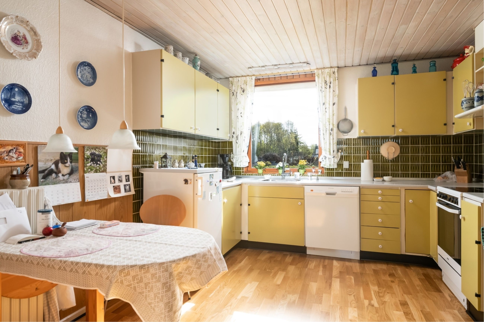 Boligen er indrettet med vindfang med indgang til stort bryggers med bordarrangement, entré, pænt køkken med spiseplads, stor lys vinkelstue med nyere brændeovn, soveværelse, 2 værelser, badeværelse med bruseniche. Fra entré udgang til terrasse, derfra indgang til skøn havestue.