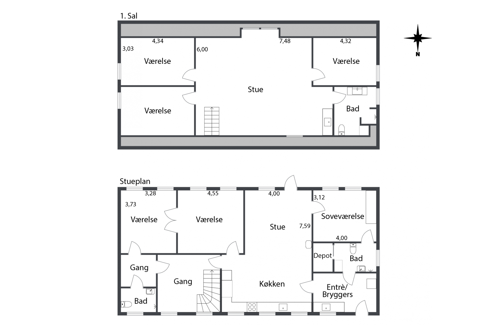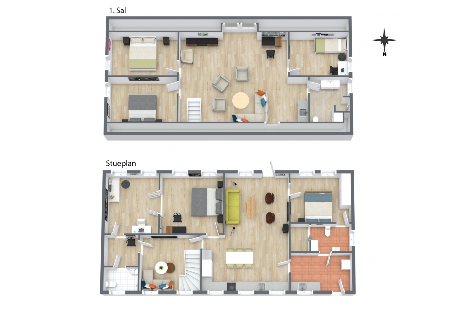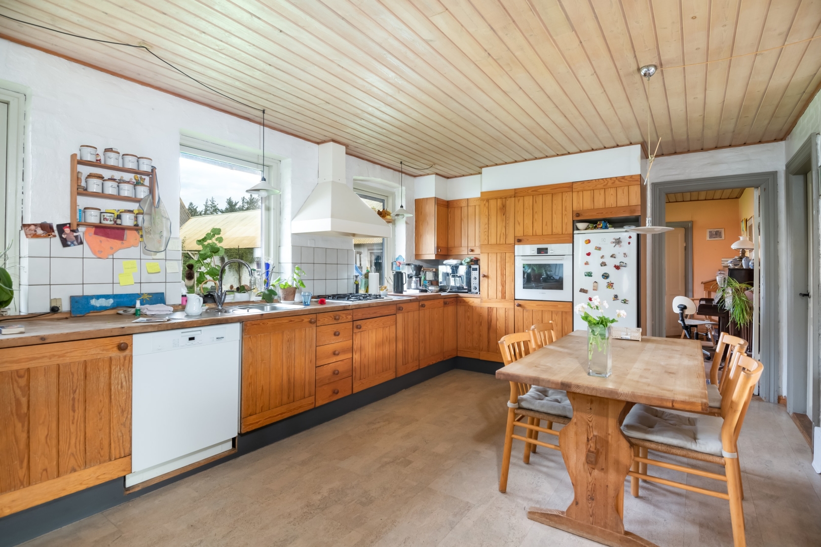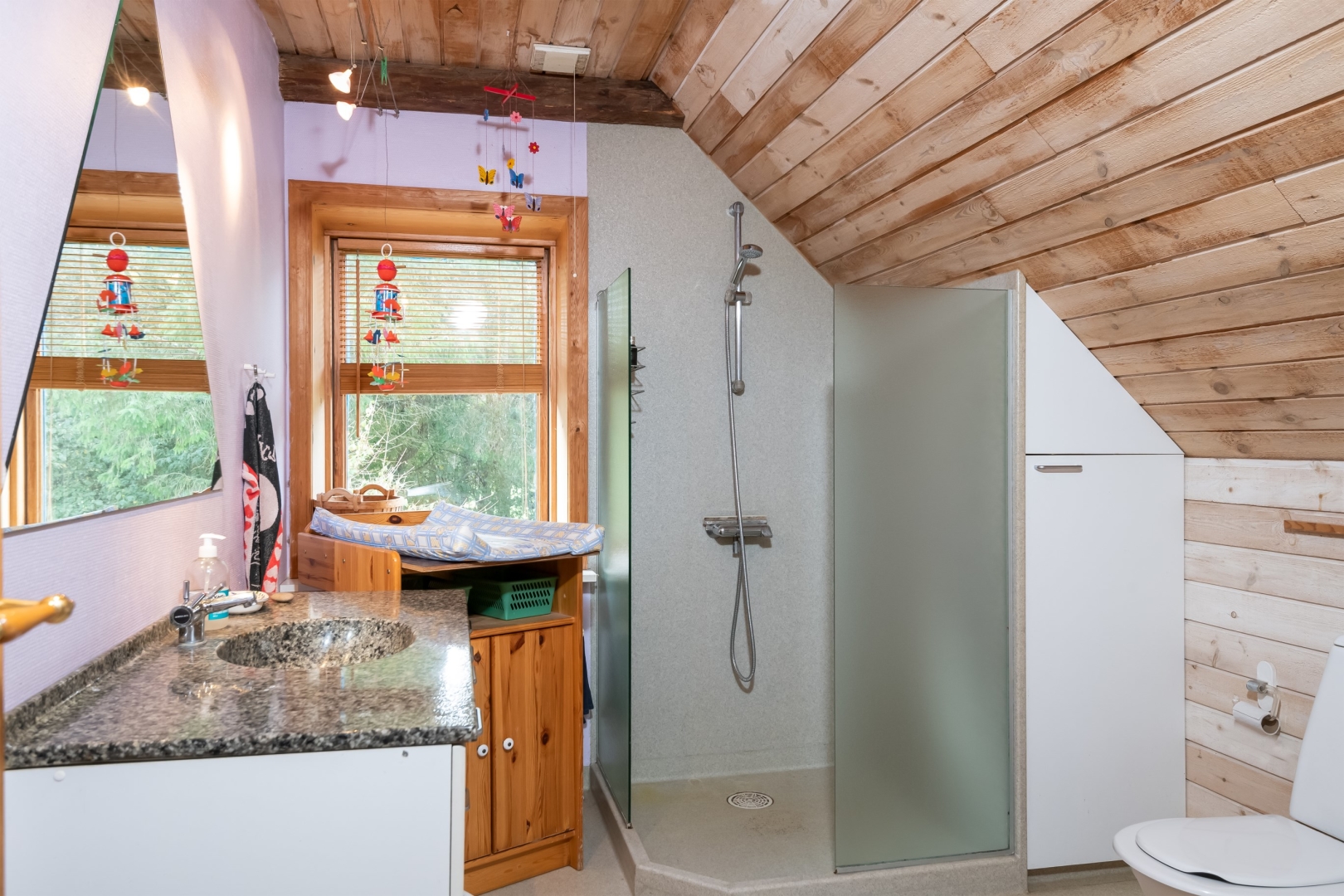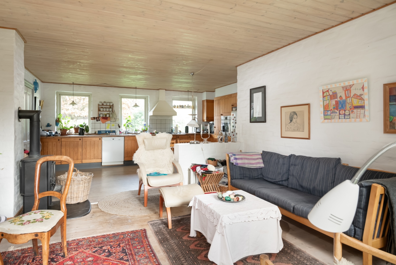 Fritliggende bolig i 2 plan indrettet med i stueplan entré/bryggers, stort køkken/alrum med brændeovn og udgang til sydvendt have, soveværelse, 2 værelser, 2 badeværelser, hall med god trappeopgang til 1. sal med hyggelig opholdsstue med loft til kip og stort vinduesparti mod syd, 3 værelser og badeværelse med bruseniche.