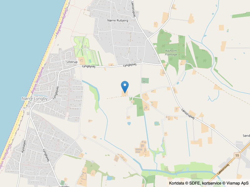 Ejendommen er frit og ugeneret beliggende ved enden af lukket vej, i naturskønt område nær Lyngby Strand og Kajholm Plantage. 7 km og 10 km til henholdsvis Lønstrup og Løkken, som begge er kendte feriebyer.