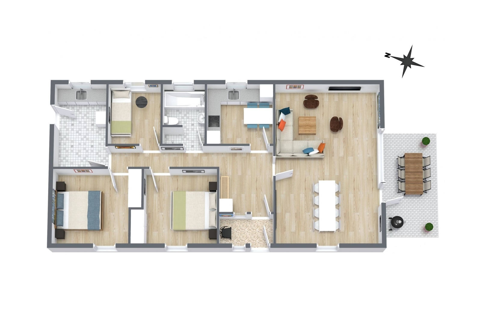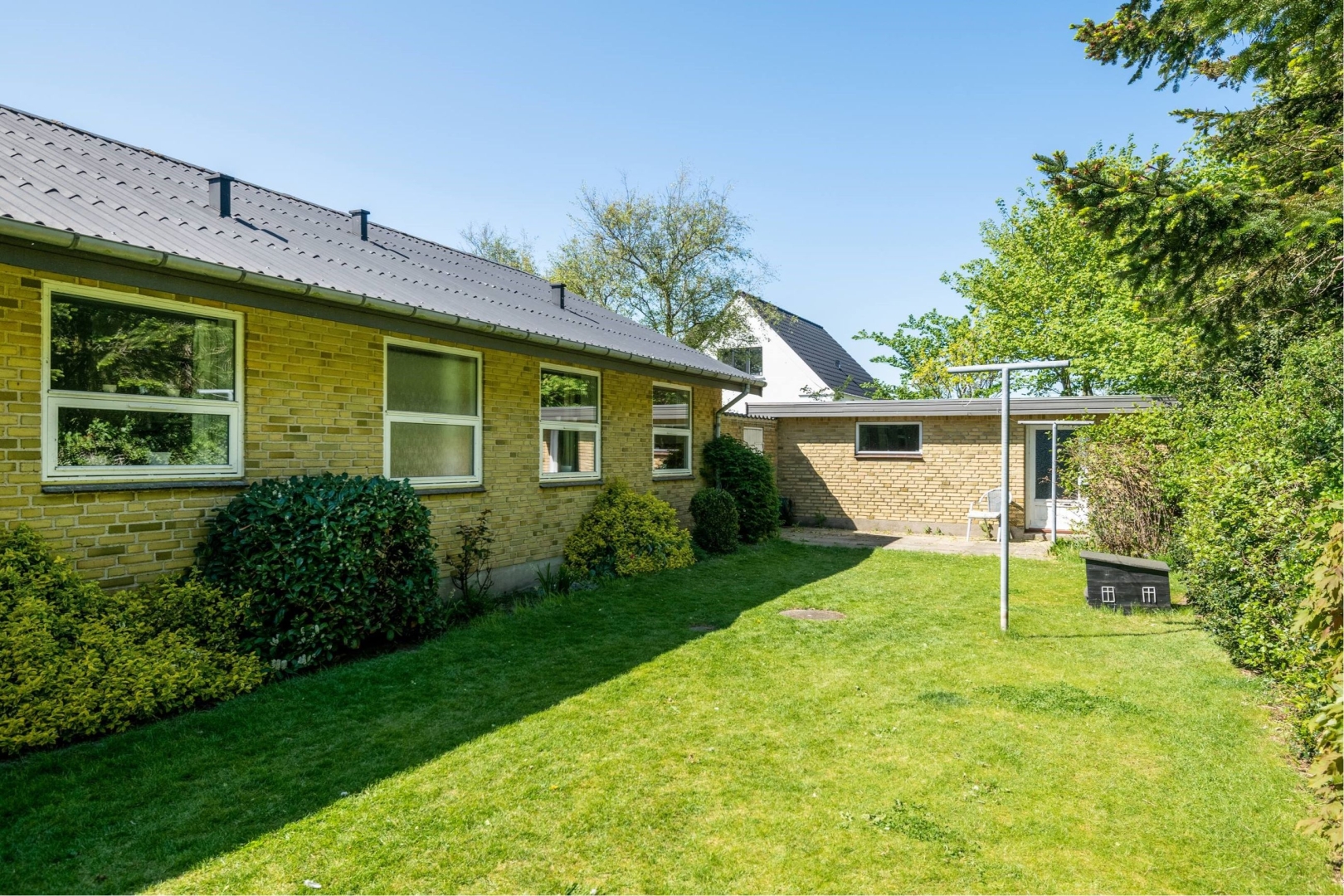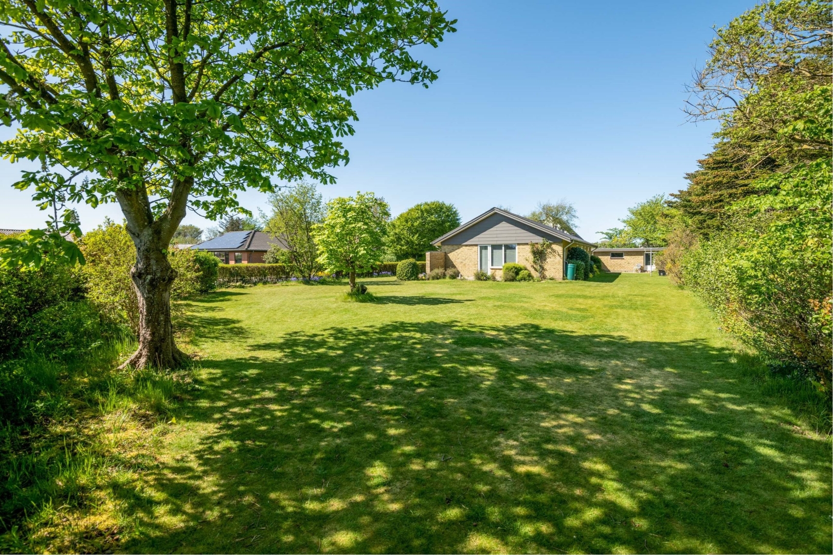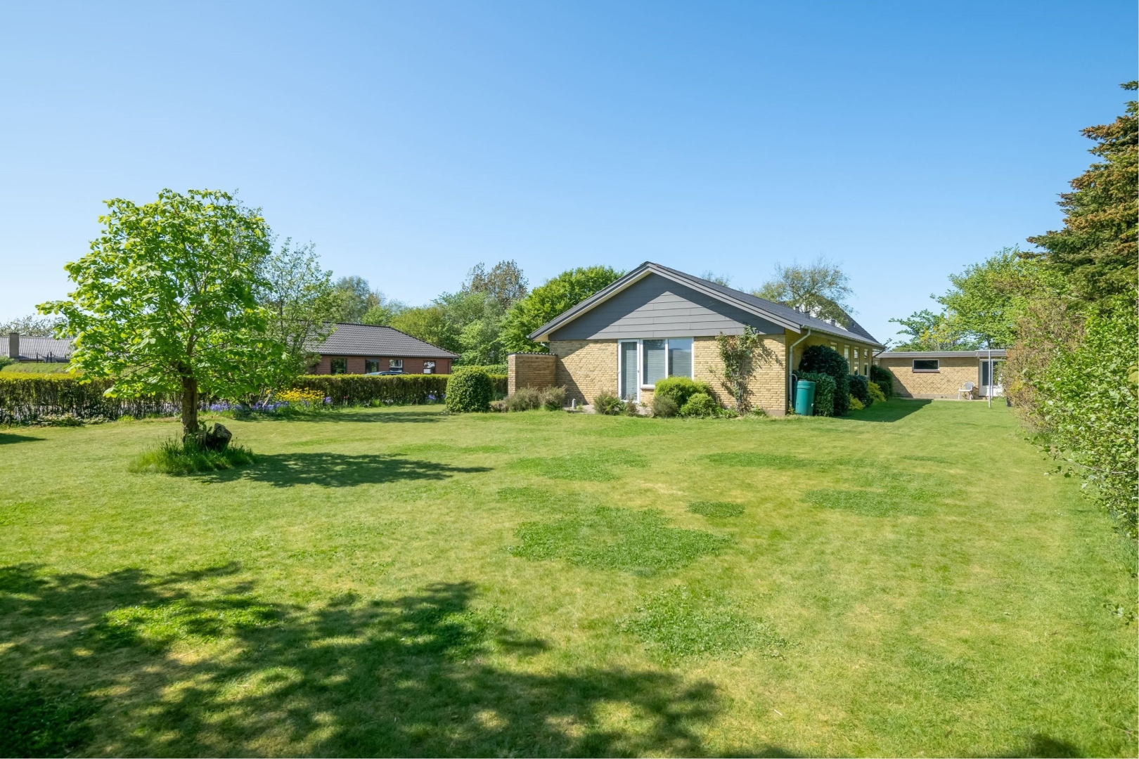Stor velanlagt og overkommelig have med stor græsplæne.