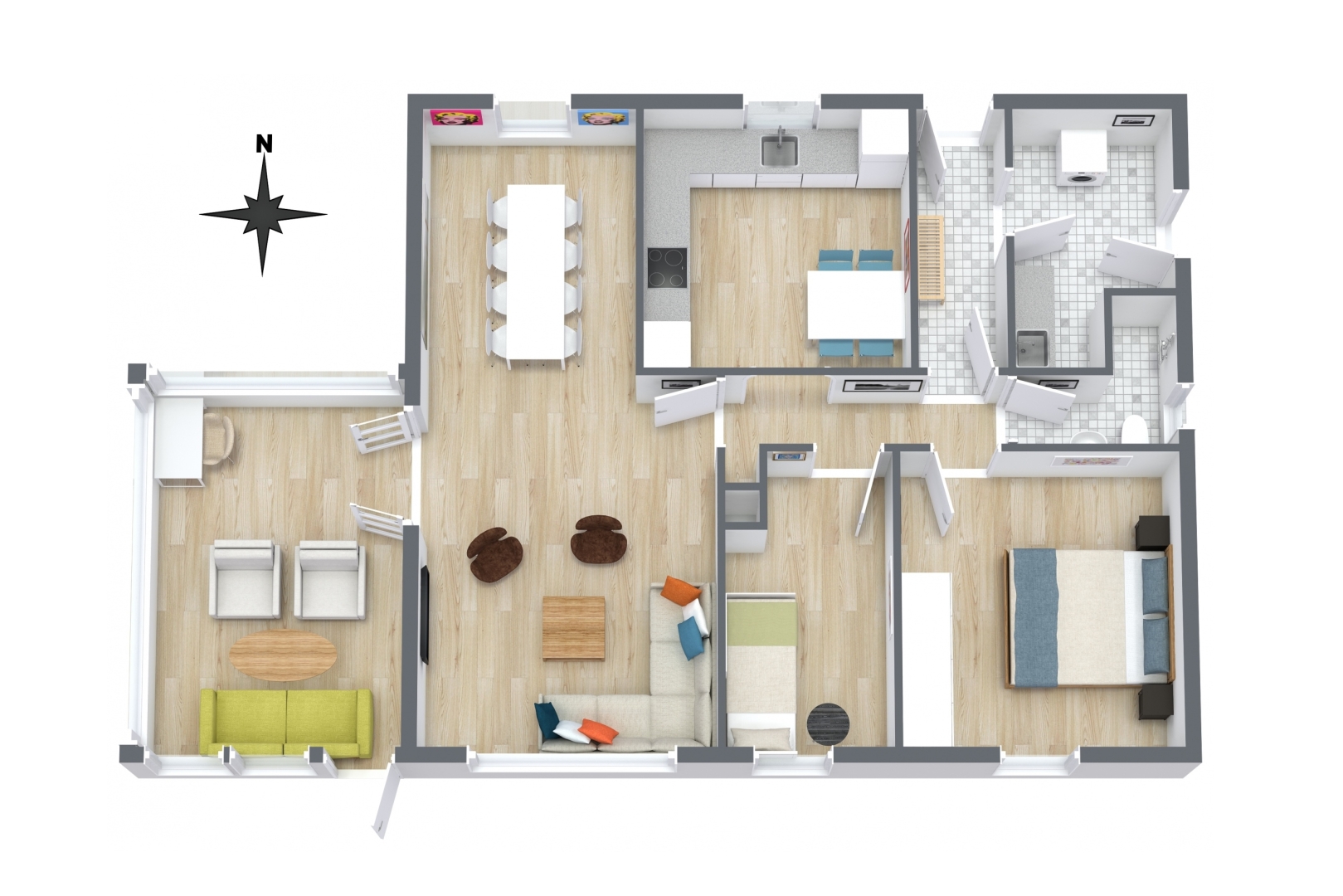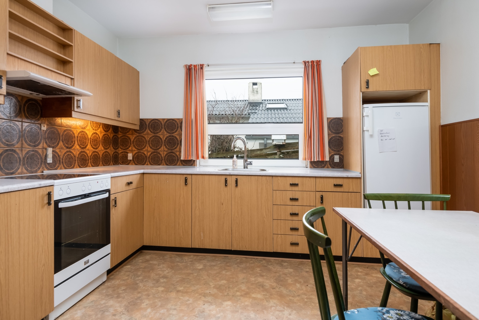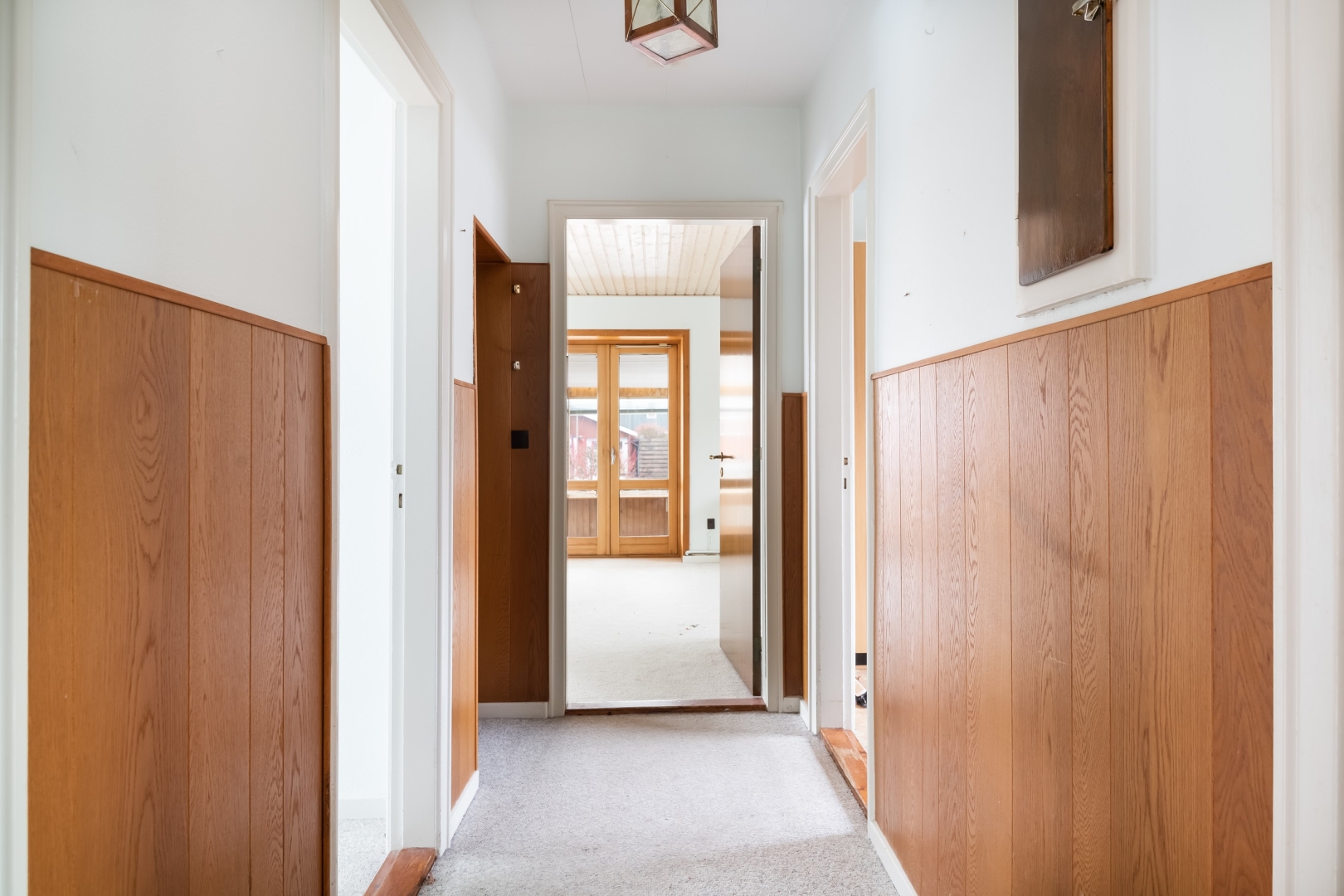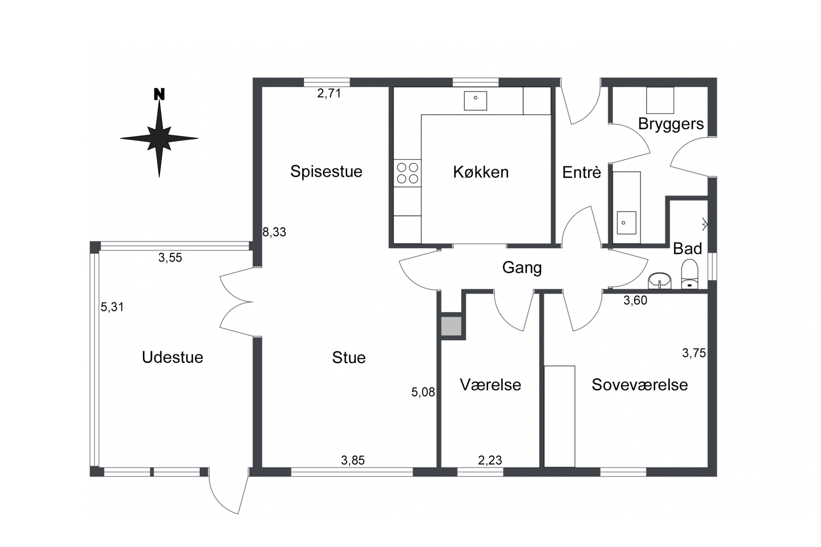 Boligen som er veldisponeret er med entré med adgang til bryggers med bordarrangement, køkken med spiseplads, spise- og opholdsstue med udgang gennem glas dobbeltdør til skøn 19 m² stor udestue, badeværelse med bruseniche, soveværelse med gode faste skabe og værelse.