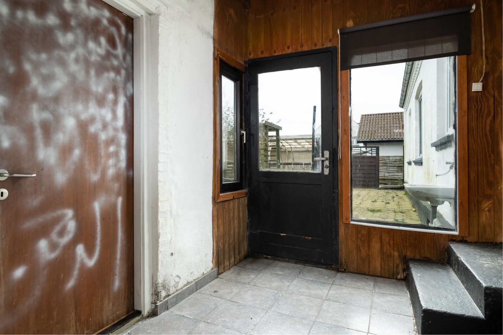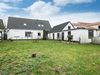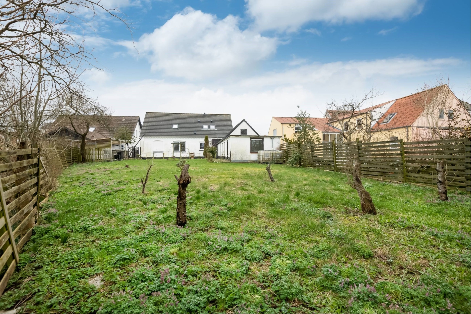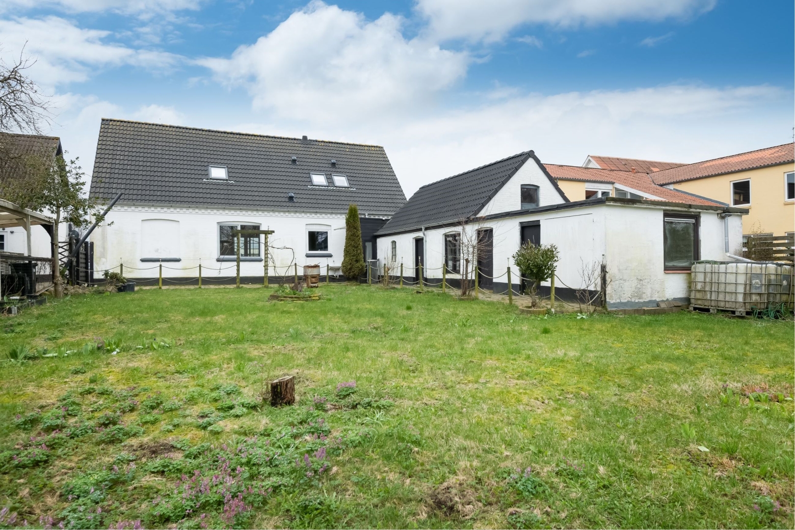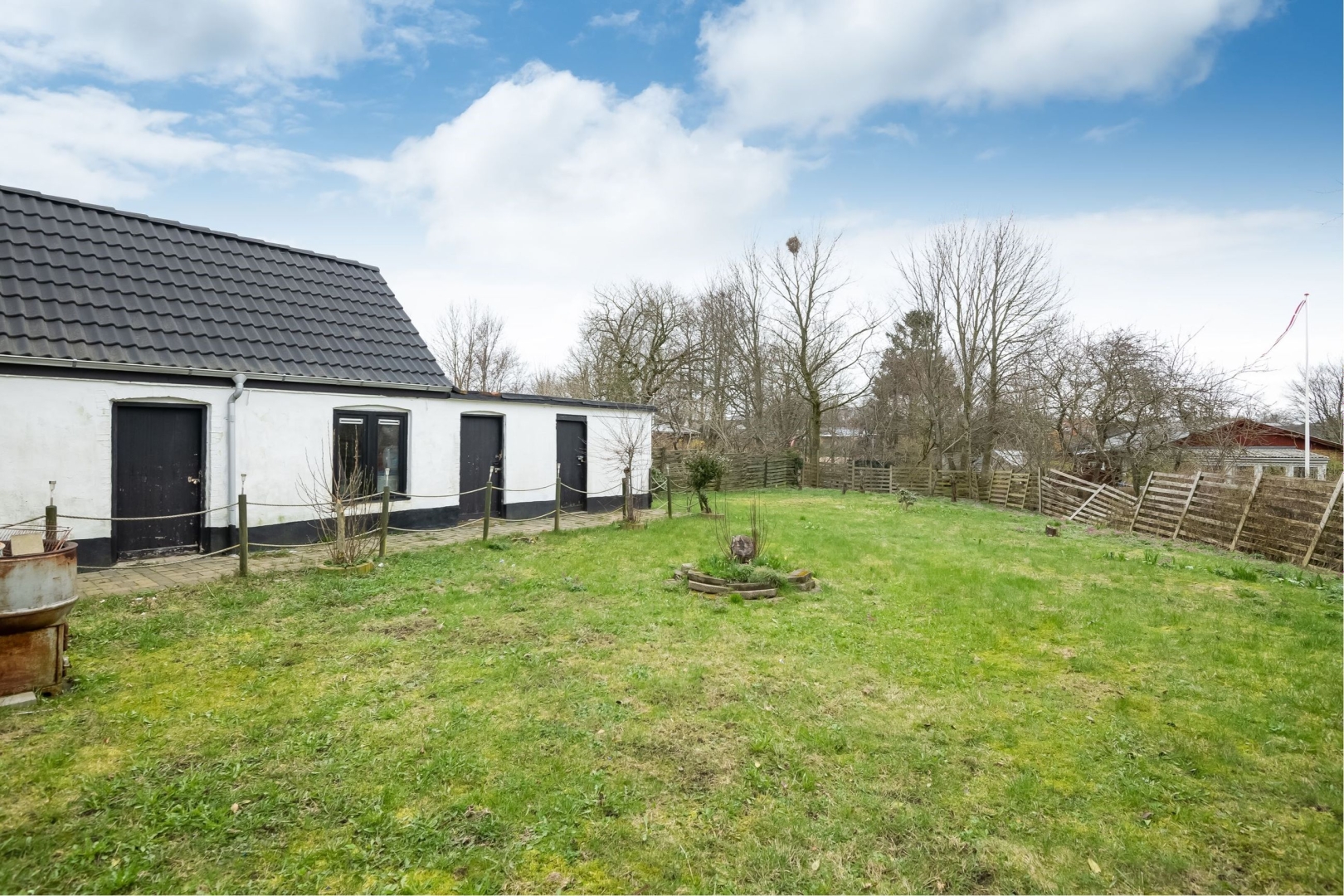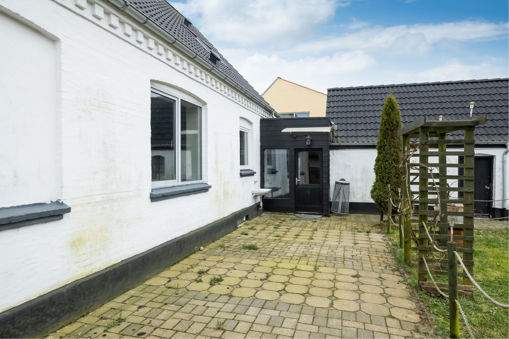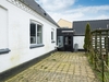 Stor flisebelægning foran huset med god mulighed for parkering, større have hvoraf størstedelen er udlagt i græs.