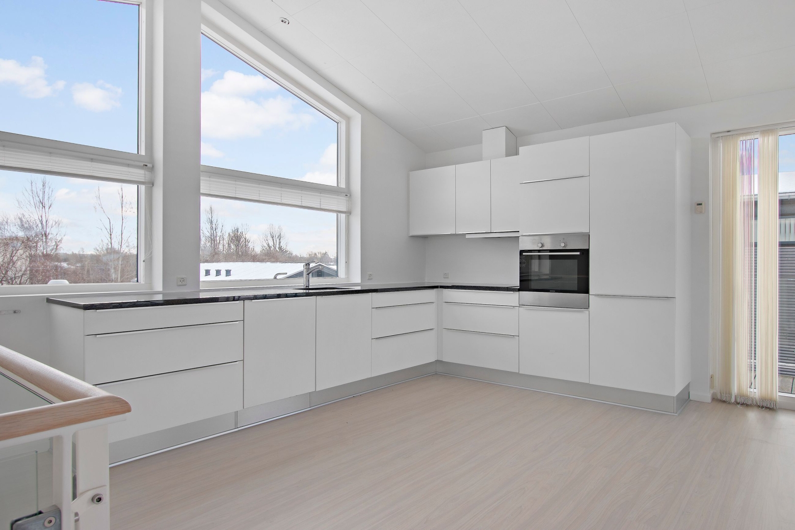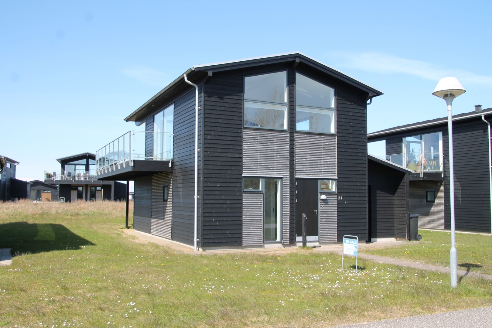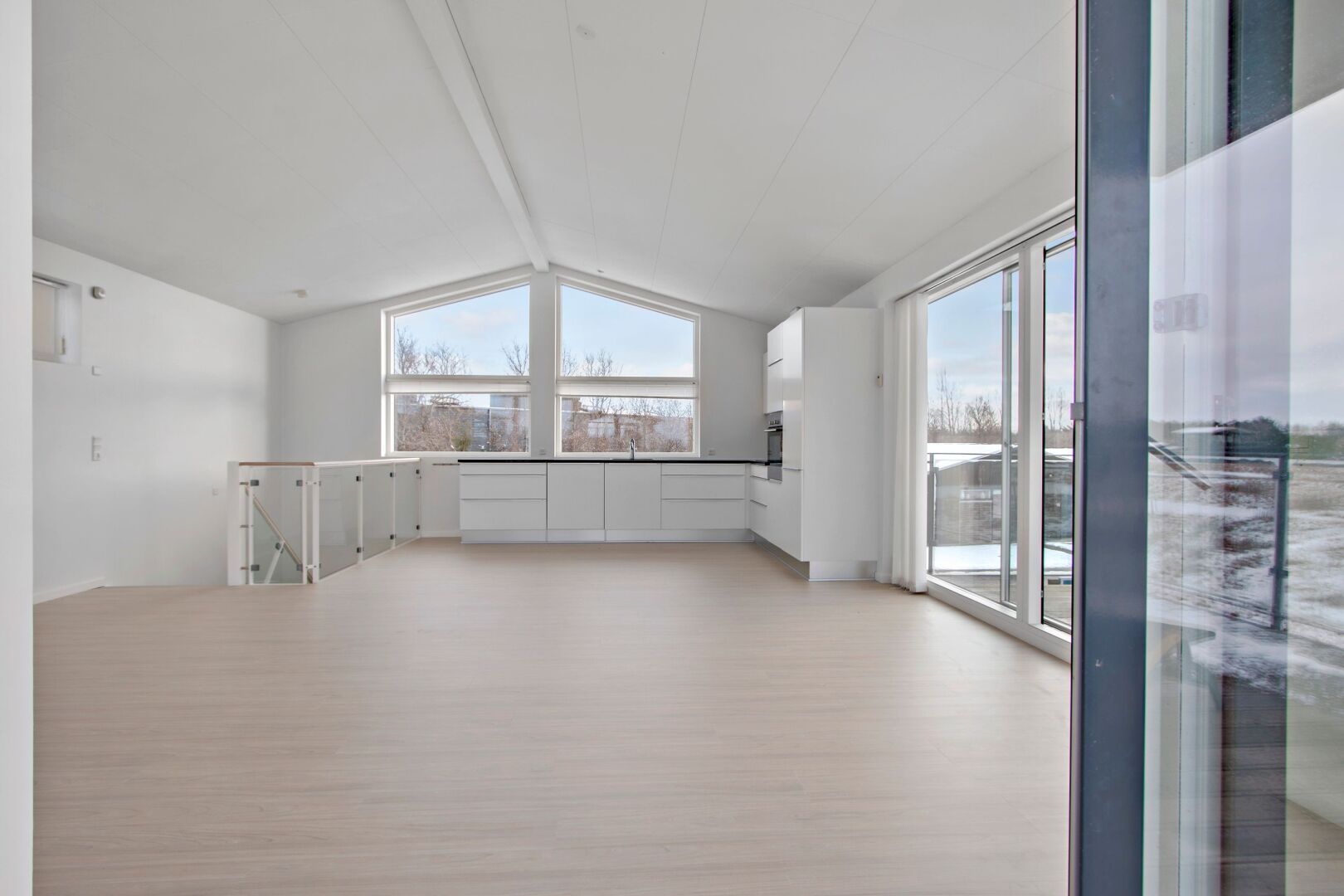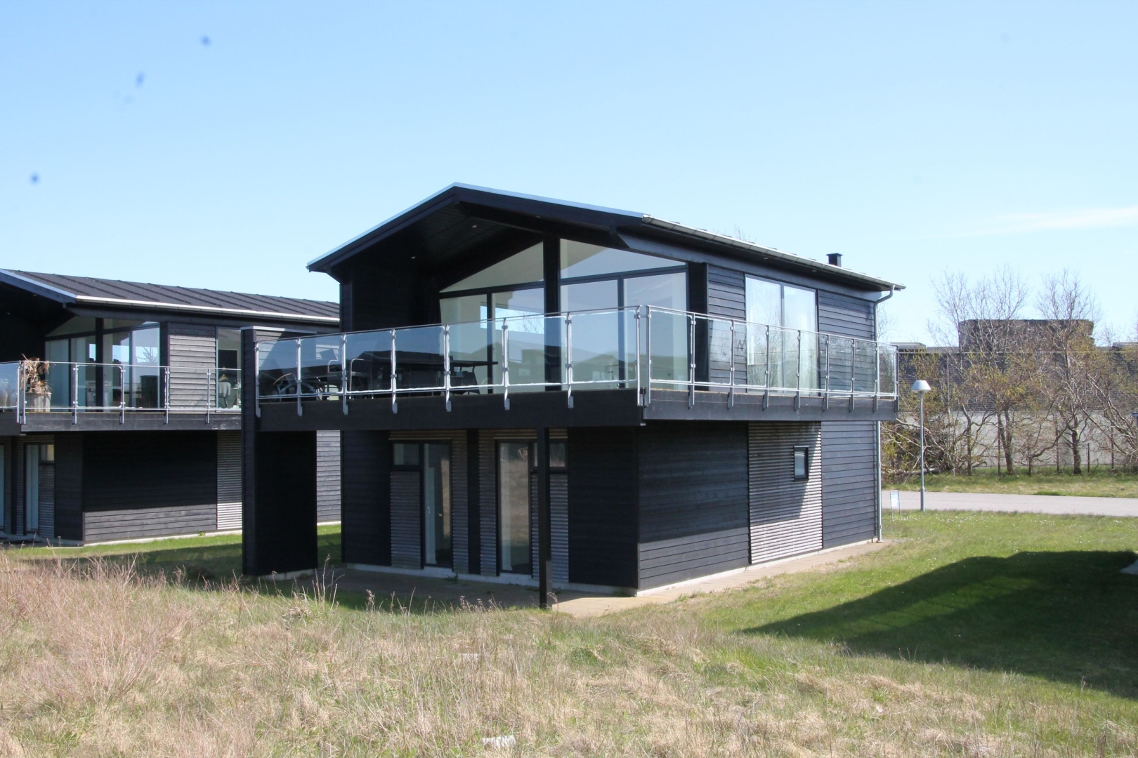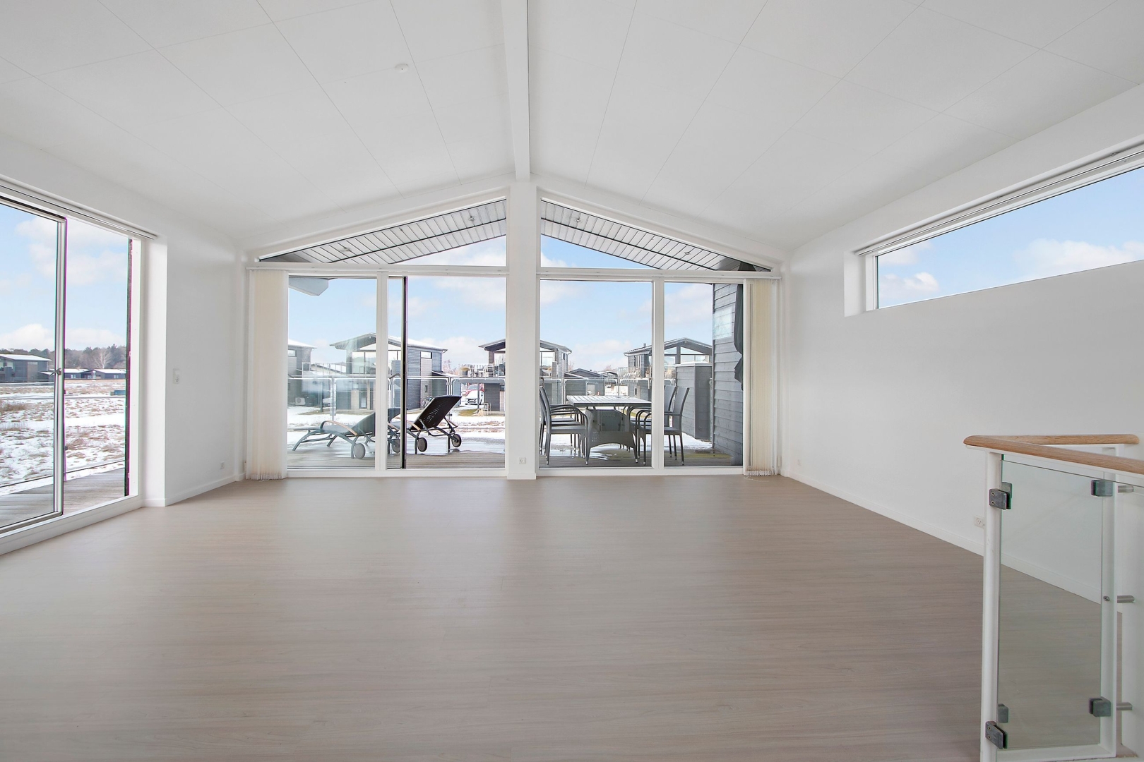 Huset er i to plan og det 40 m² store opholdsrum og køkkenafdeling ligger på 1. sal. Fra stuen er der udgang til den store balkon, hvor udsigten og solen kan nydes fra tidligt til sent.