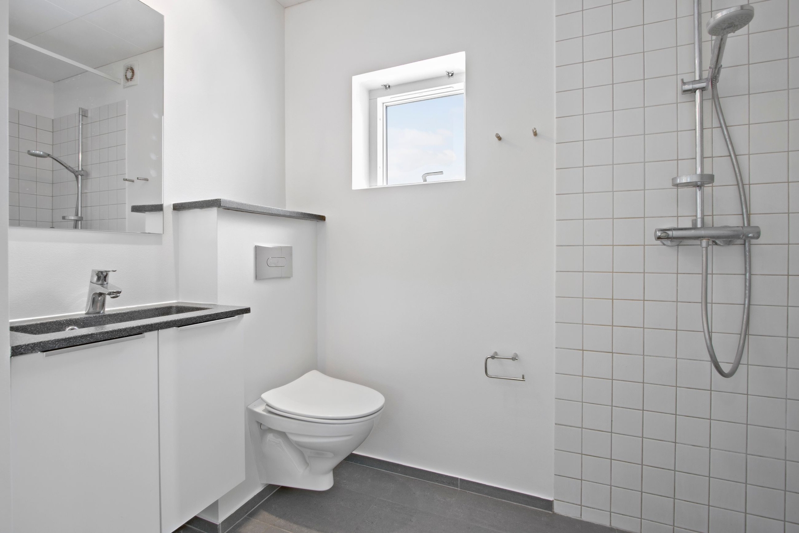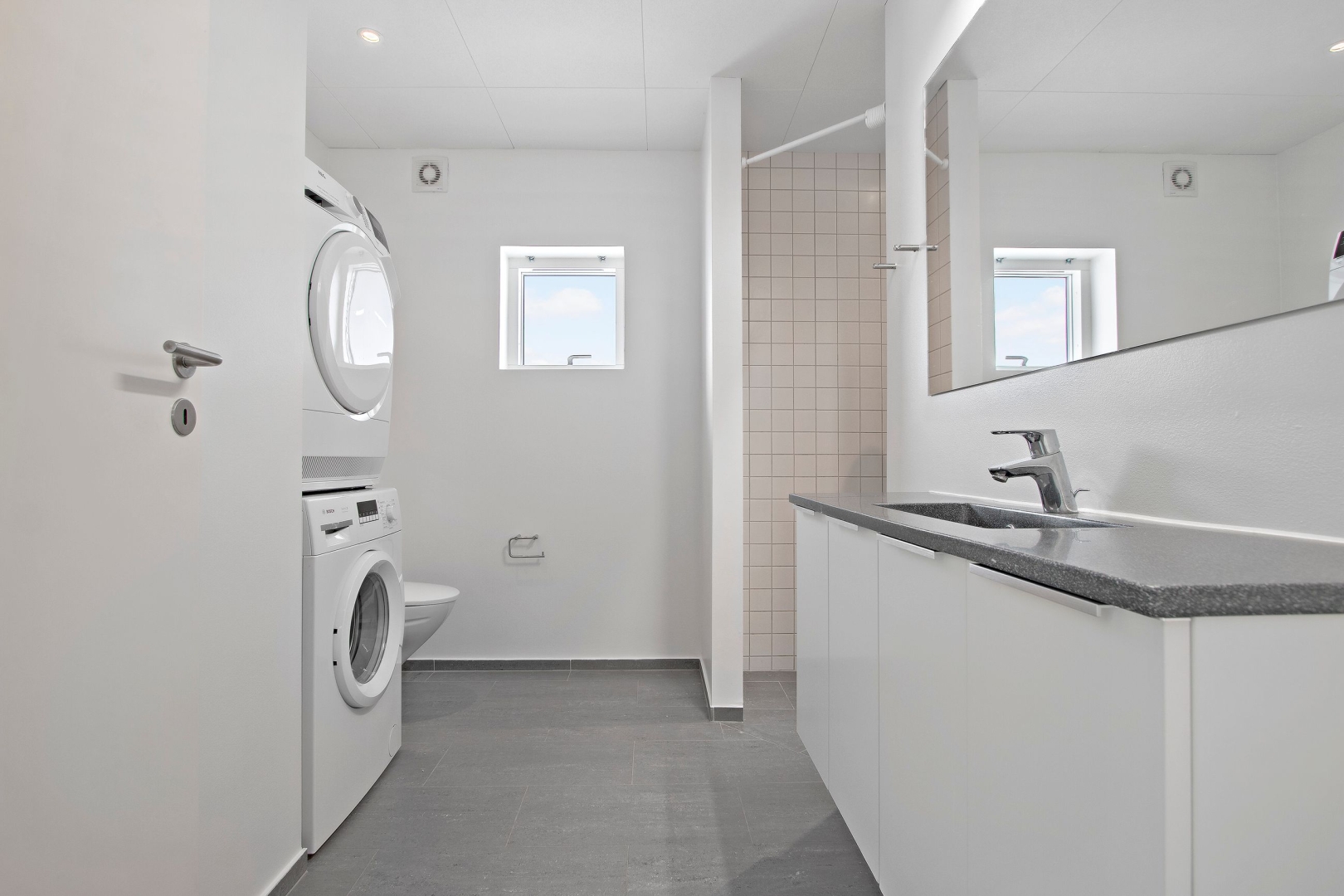 ene badeværelse er der lavet plads til vaskesøjle.