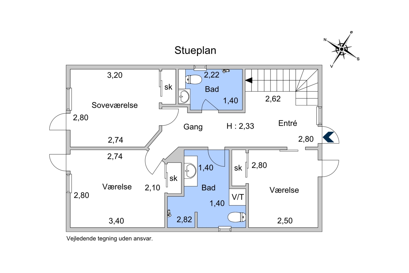 klinkegulv. 3 værelser, alle med indbyggede skabe og trægulve. 2 badeværelser med brusenicher, på det